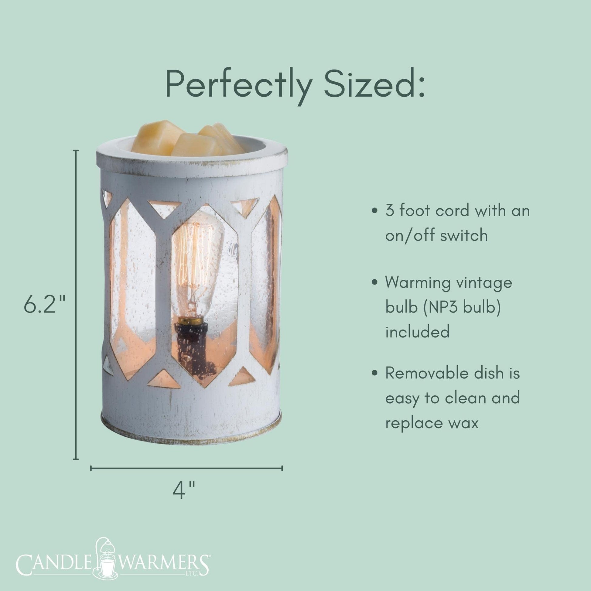 The warmer includes an NP5 warming bulb and features a 3-foot cord with an easy on/off dial switch. Measuring approximately 8.8” x 4.6” x 4.6”, it’s the perfect decorative addition to any room. A 1-year limited warranty covers any factory defects for peace of mind.